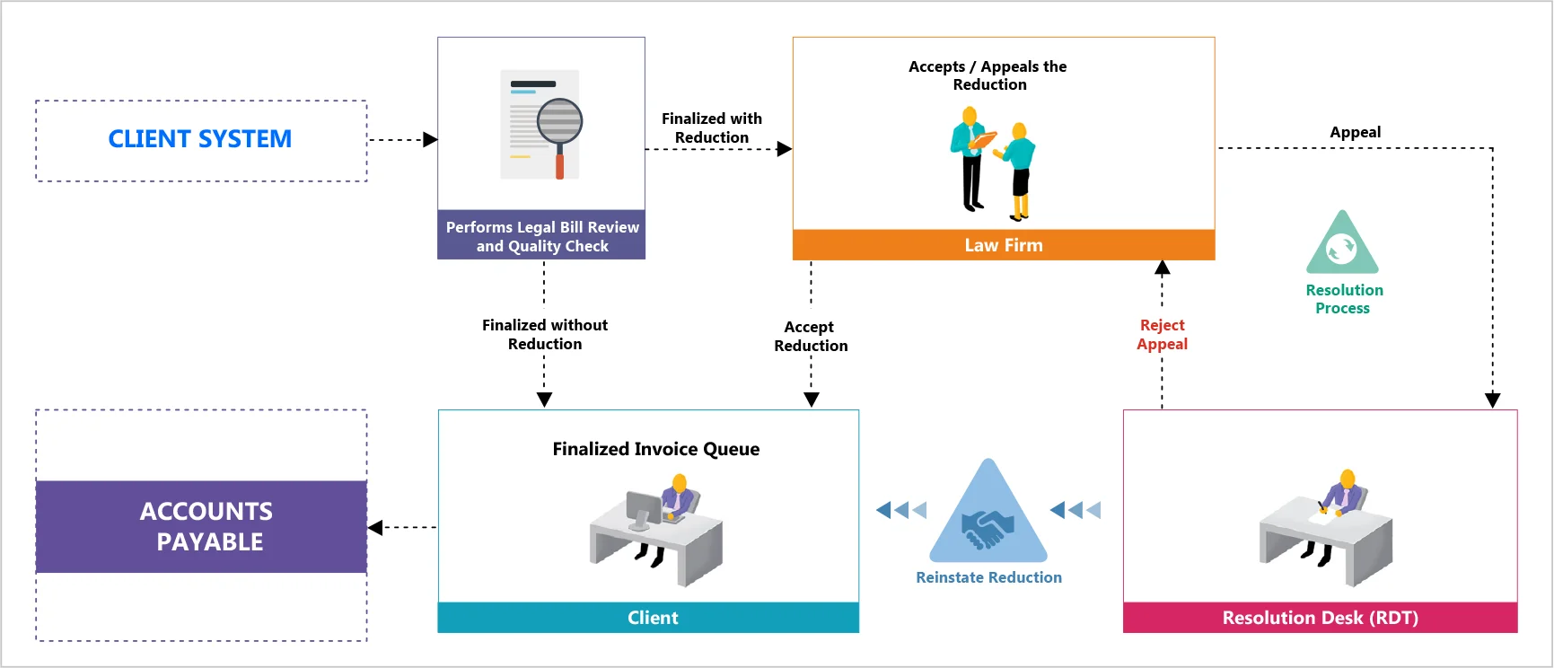 Take a look at the workflow graphic below for a view of how LSG deploys AI-bill review in live environments within the organizations we work with. We handle the end-to-end audited legal process, from legal invoice input and review, to invoice query resolution, and finally accounts payable